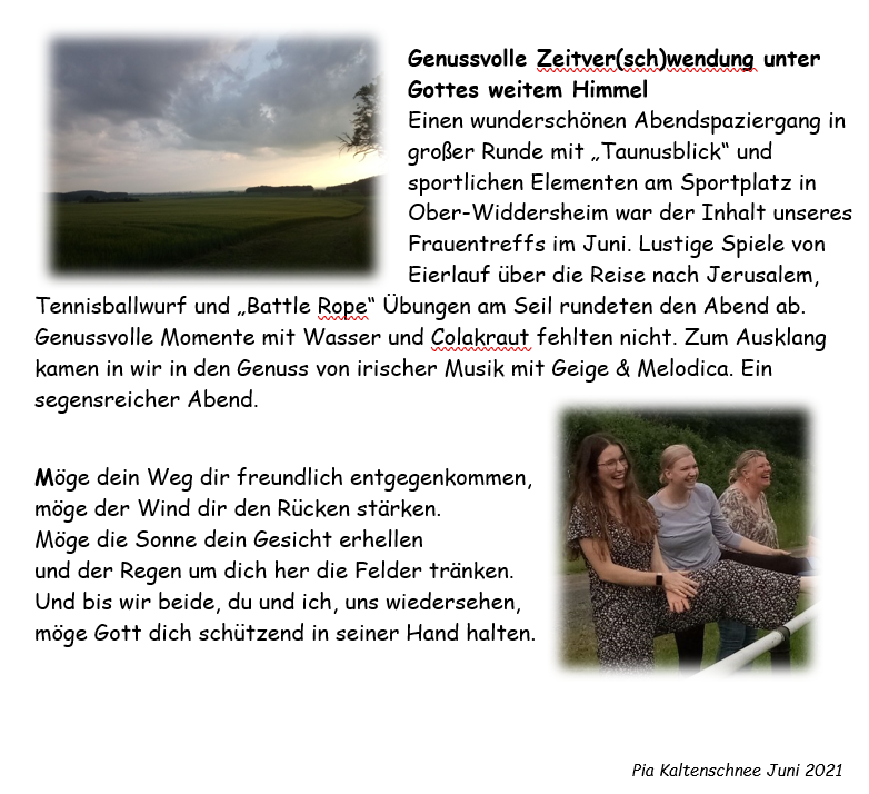 Wir wollen Erfahrungen austauschen, Anregendes und Hilfreiches für unser Leben im Alltag mitnehmen, Neues entdecken und auch mal kreativ sein. Wir wollen unsere tollen Ideen vertiefen, einfach mal raus aus dem Alltag, entspannen und auftanken und dies in netter Gesellschaft bei einem Gesprächsabend, Gebetsabend, dem perfekten „Bibeldinner", einem Taizéabend oder Themenabend. Und immer wieder gibt es in verschiedenster Form Impulse für unseren christlichen Glauben.